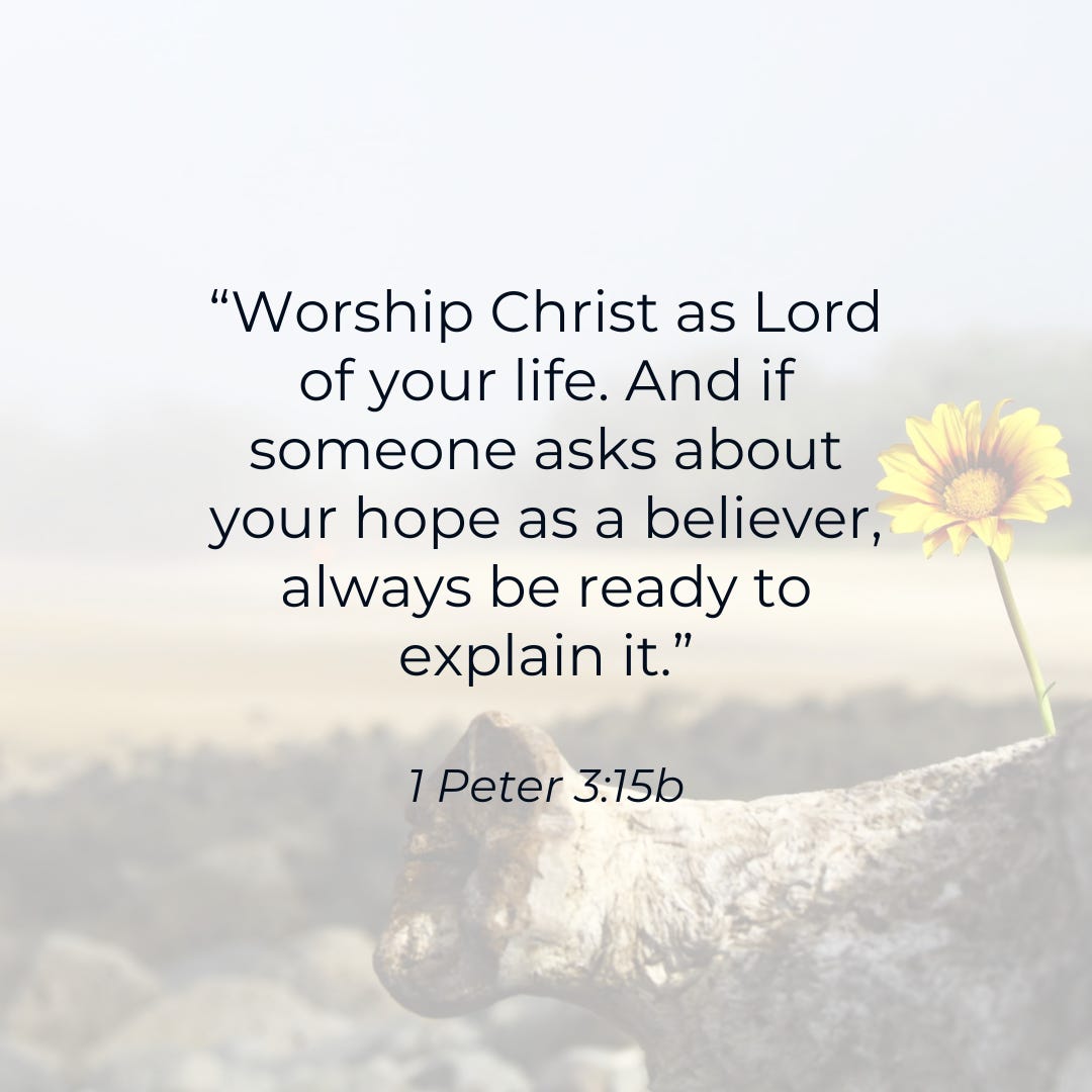 “Worship Christ as Lord of your life. And if someone asks about your hope as a believer, always be ready to explain it.” 1 Peter 3:15b